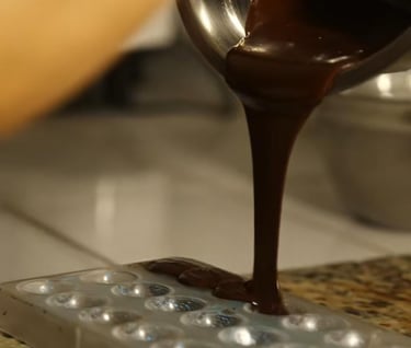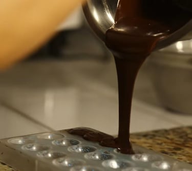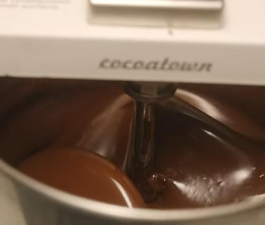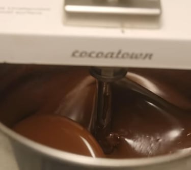Para la bombonería, la pasta de cacao pasa por una maquina refinadora (melanger) junto a otros ingredientes necesarios, refinando por varias horas para ofrecer esa textura suave y cremosa.